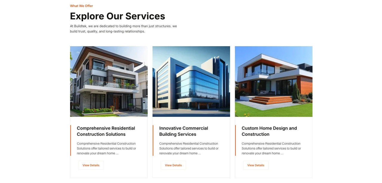 What We Offer Explore Our Services At Buildtek, we are dedicated to building more than just structures. we build trust, quality, and long-lasting relationships. Comprehensive Residential Construction Solutions Comprehensive Residential Construction Solutions offer tailored services to build or renovate your dream home … View Details Innovative Commercial Building Services Comprehensive Residential Construction Solutions offer tailored […]