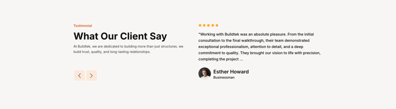 Testimonial What Our Client Say At Buildtek, we are dedicated to building more than just structures. we build trust, quality, and long-lasting relationships. “Working with Buildtek was an absolute pleasure. From the initial consultation to the final walkthrough, their team demonstrated exceptional professionalism, attention to detail, and a deep commitment to quality. They brought our […]