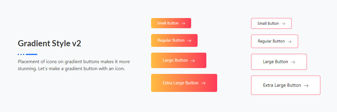 Gradient Style v2 Placement of icons on gradient buttons makes it more stunning. Let’s make a gradient button with an icon. Small Button Regular Button Large Button Extra Large Button Small Button Regular Button Large Button Extra Large Button