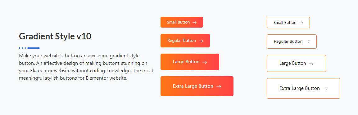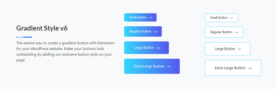 Gradient Style v6 The easiest way to create a gradient button with Elementor for your WordPress website. Make your buttons look outstanding by adding our exclusive button style on your page. Small Button Regular Button Large Button Extra Large Button Small Button Regular Button Large Button Extra Large Button