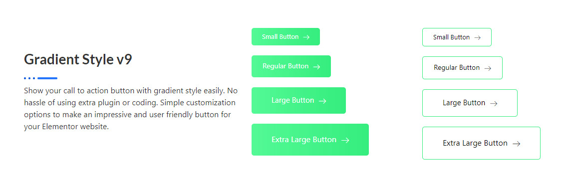 Gradient Style v9 Show your call to action button with gradient style easily. No hassle of using extra plugin or coding. Simple customization options to make an impressive and user friendly button for your Elementor website. Small Button Regular Button Large Button Extra Large Button Small Button Regular Button Large Button Extra Large Button