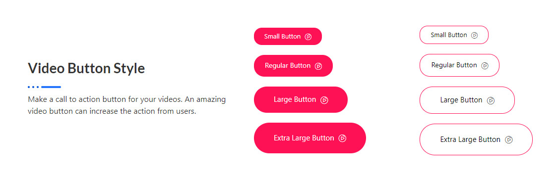 Video Button Style Make a call to action button for your videos. An amazing video button can increase the action from users. Small Button Regular Button Large Button Extra Large Button Small Button Regular Button Large Button Extra Large Button