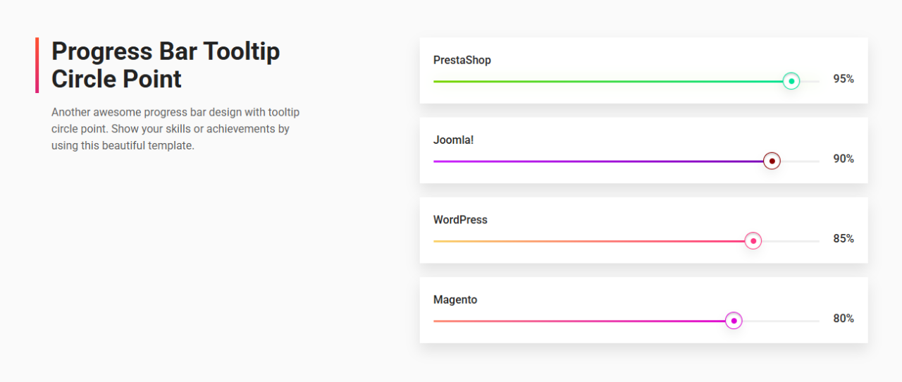 Progress Bar Tooltip Circle Point Another awesome progress bar design with tooltip circle point. Show your skills or achievements by using this beautiful template. PrestaShop 0% Joomla! 0% WordPress 0% Magento 0%