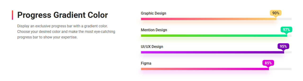 Progress Gradient Color Display an exclusive progress bar with a gradient color. Choose your desired color and make the most eye-catching progress bar to show your expertise. Graphic Design 0% Mention Design 0% UI/UX Design 0% Figma 0%