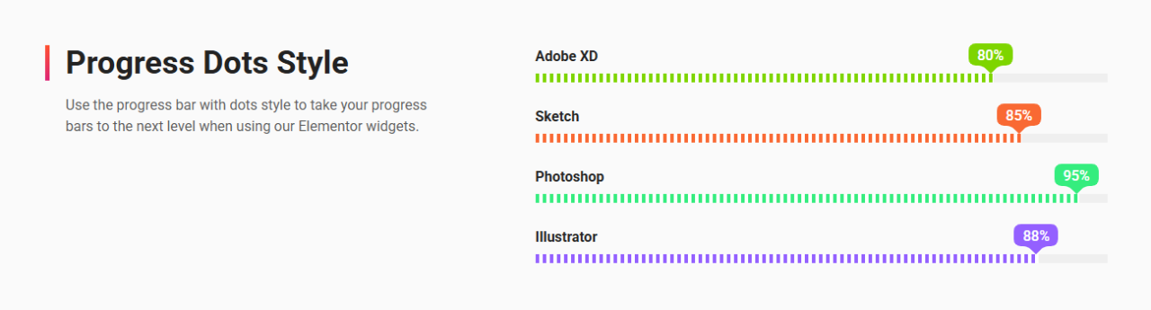 Progress Dots Style Use the progress bar with dots style to take your progress bars to the next level when using our Elementor widgets. Adobe XD 0% Sketch 0% Photoshop 0% Illustrator 0%