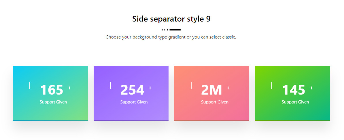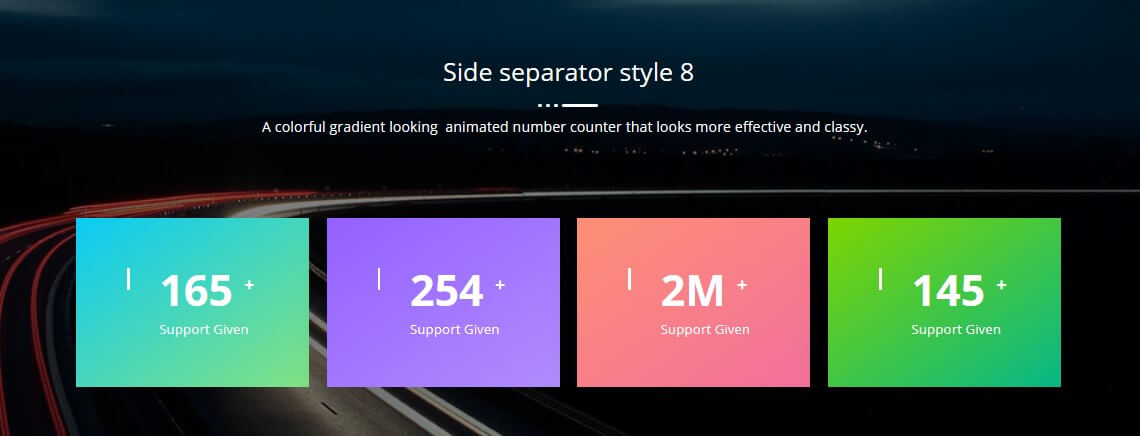 Side separator style 8 A colorful gradient looking animated number counter that looks more effective and classy. 0 + Happy Customers 0 + Project Complete 0 + Registered Member 0 + Awards Winning