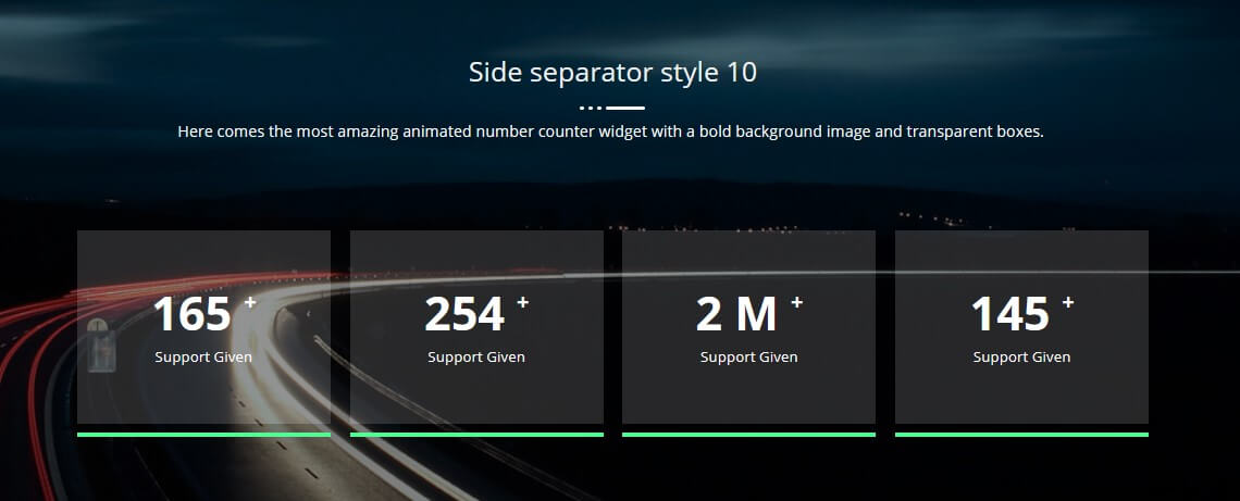 Side separator style 10 Here comes the most amazing animated number counter widget with a bold background image and transparent boxes. 0 + Happy Customers 0 + Project Complete 0 M + Registered Member 0 + Awards Winning