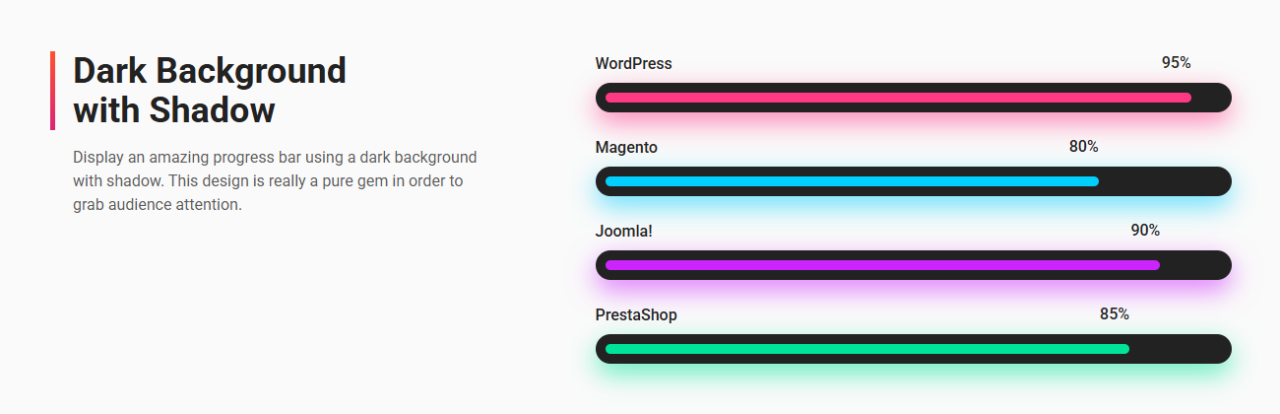Dark Background with Shadow Display an amazing progress bar using a dark background with shadow. This design is really a pure gem in order to grab audience attention. WordPress 0% Magento 0% Joomla! 0% PrestaShop 0%