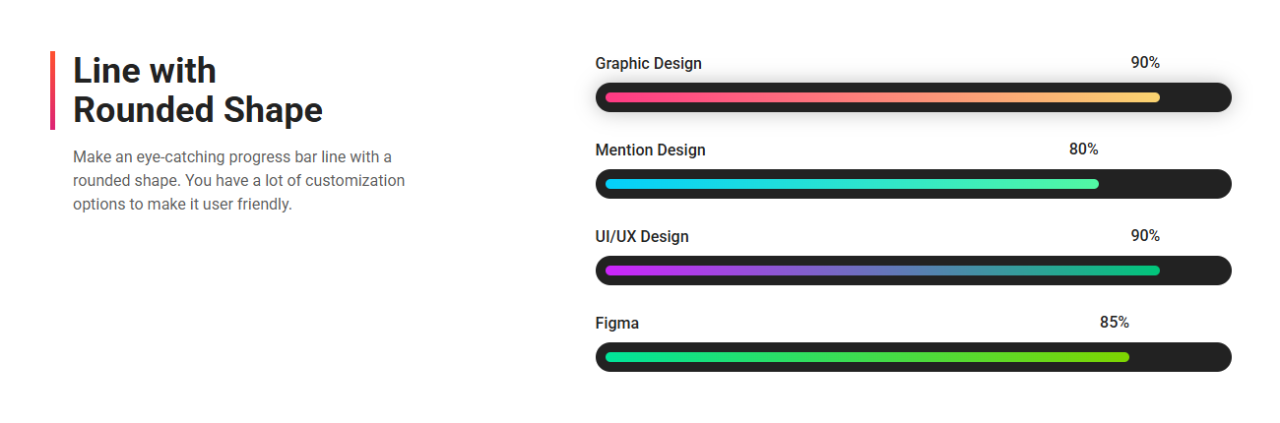 Line with Rounded Shape Make an eye-catching progress bar line with a rounded shape. You have a lot of customization options to make it user friendly. Graphic Design 0% Mention Design 0% UI/UX Design 0% Figma 0%