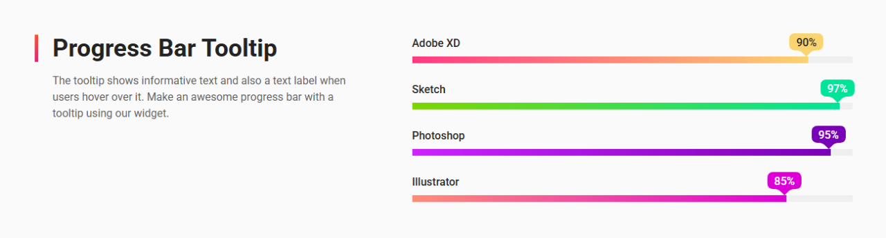 Progress Bar Tooltip The tooltip shows informative text and also a text label when users hover over it. Make an awesome progress bar with a tooltip using our widget. Adobe XD 0% Sketch 0% Photoshop 0% Illustrator 0%