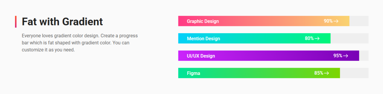 Fat with Gradient Everyone loves gradient color design. Create a progress bar which is fat shaped with gradient color. You can customize it as you need. Graphic Design 0% Mention Design 0% UI/UX Design 0% Figma 0%