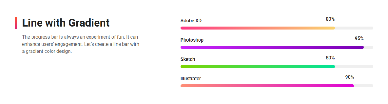Line with Gradient The progress bar is always an experiment of fun. It can enhance users’ engagement. Let’s create a line bar with a gradient color design. Adobe XD 0% Photoshop 0% Sketch 0% Illustrator 0%