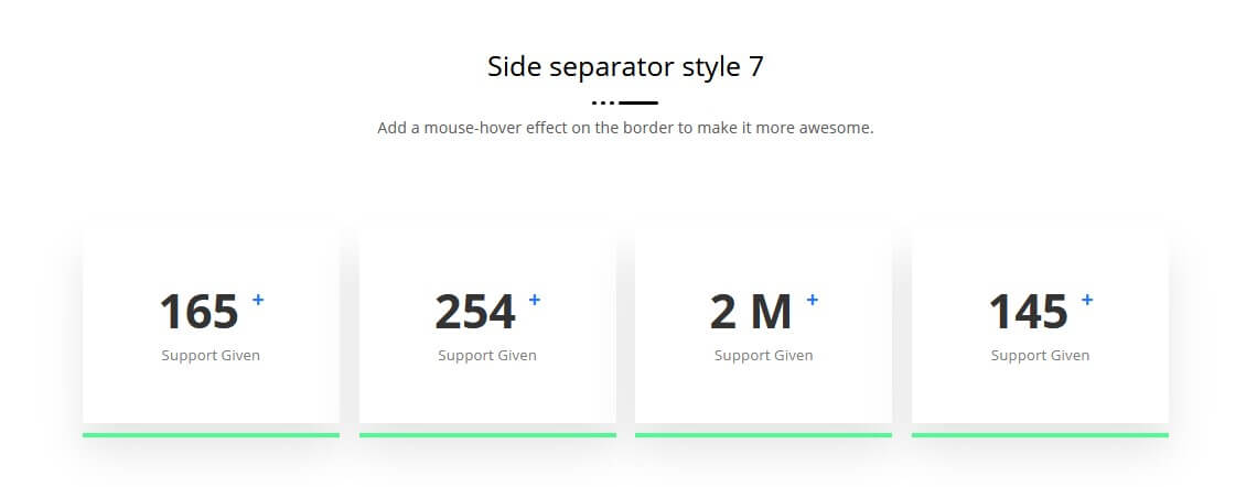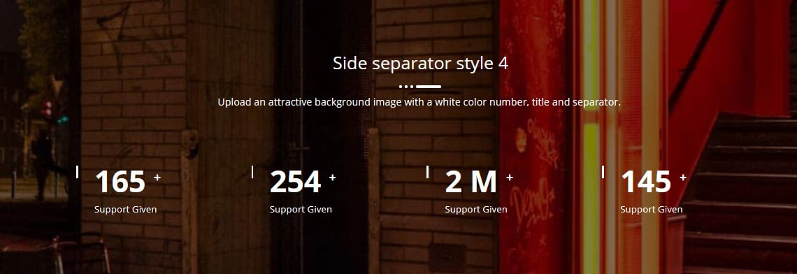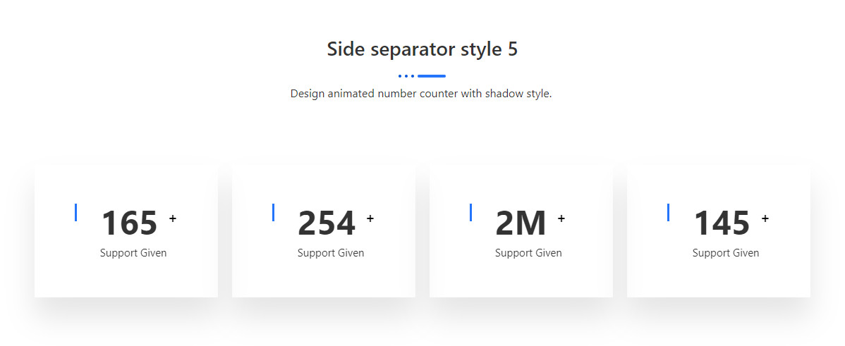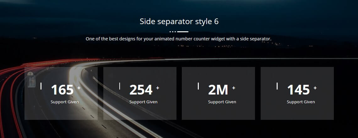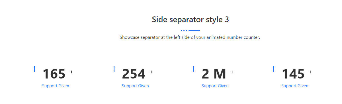 Side separator style 6 One of the best designs for your animated number counter widget with a side separator. 0 + Happy Customers 0 + Project Complete 0 + Registered Member 0 + Awards Winning