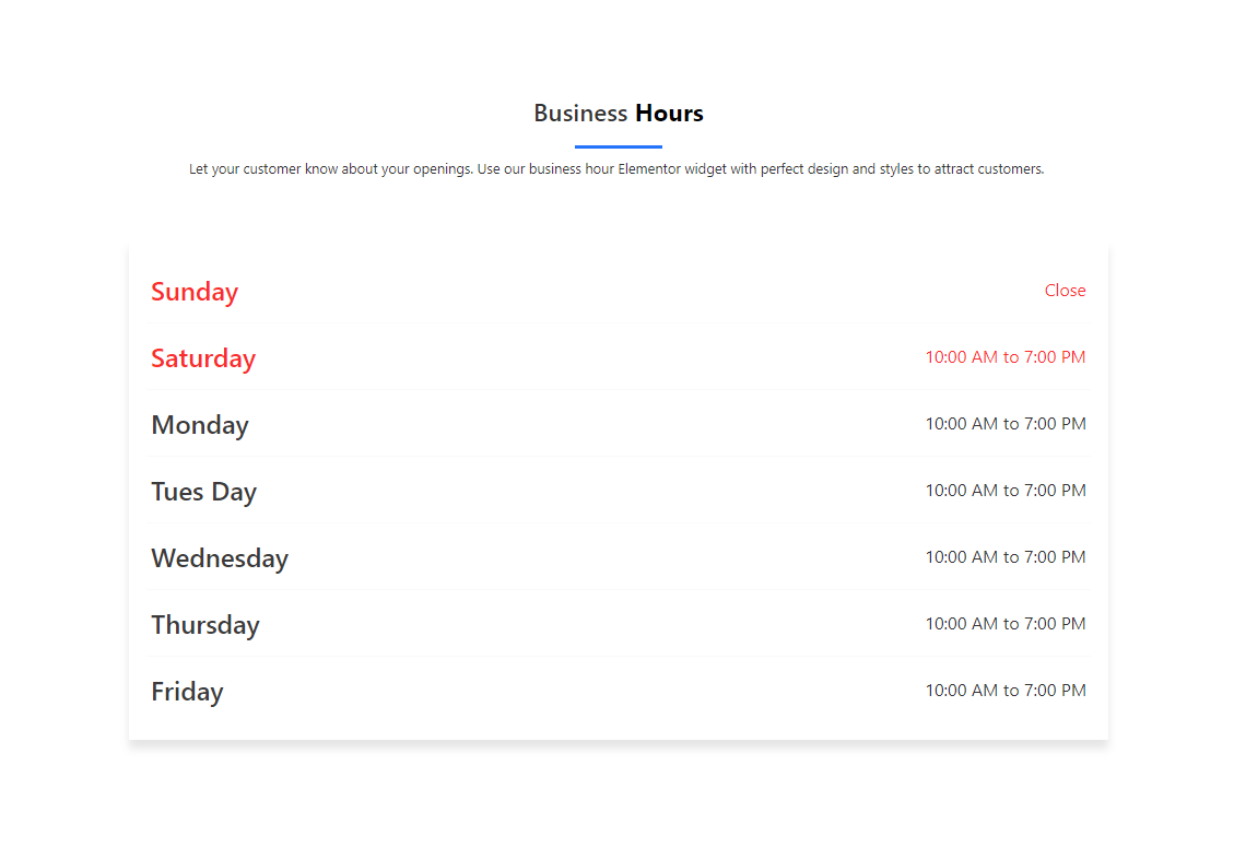 Business Hours Let your customer know about your openings. Use our business hour Elementor widget with perfect design and styles to attract customers. Sundays Close Saturday 10:00 AM to 7:00 PM Monday 10:00 AM to 7:00 PM Tues Day 10:00 AM to 7:00 PM Wednesday 10:00 AM to 7:00 PM Thursday 10:00 AM to 7:00 […]