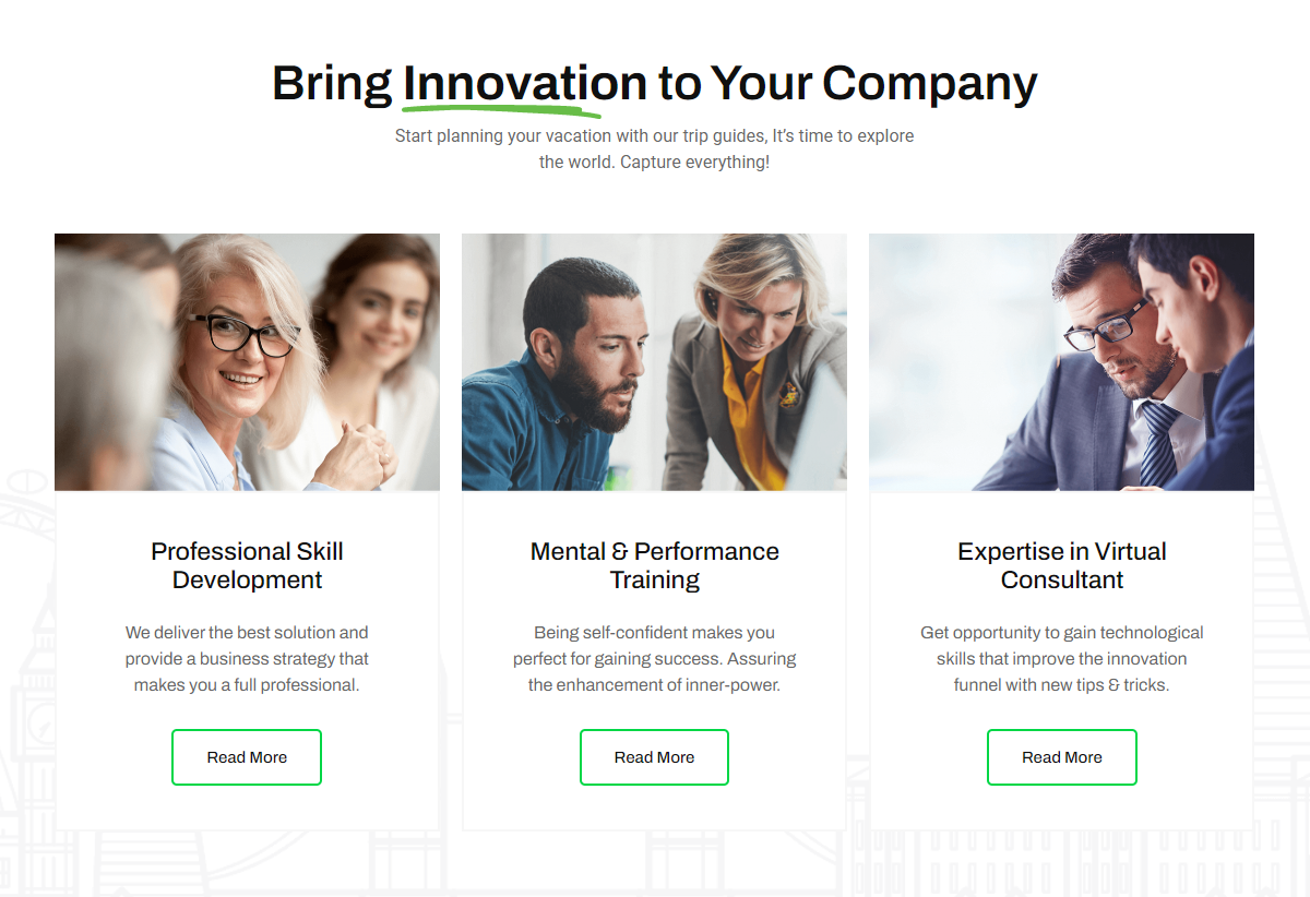 Bring Innovation to Your Company Start planning your vacation with our trip guides, It’s time to explore the world. Capture everything! Professional Skill Development We deliver the best solution and provide a business strategy that makes you a full professional. Read More Mental & Performance Training Being self-confident makes you perfect for gaining success. Assuring […]
