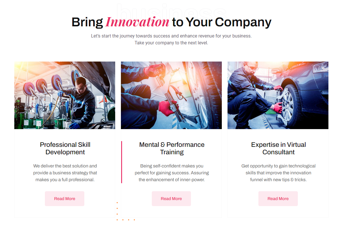 business Bring Innovation to Your Company Let’s start the journey towards success and enhance revenue for your business. Take your company to the next level. Professional Skill Development We deliver the best solution and provide a business strategy that makes you a full professional. Read More Professional Skill Development We deliver the best solution and […]