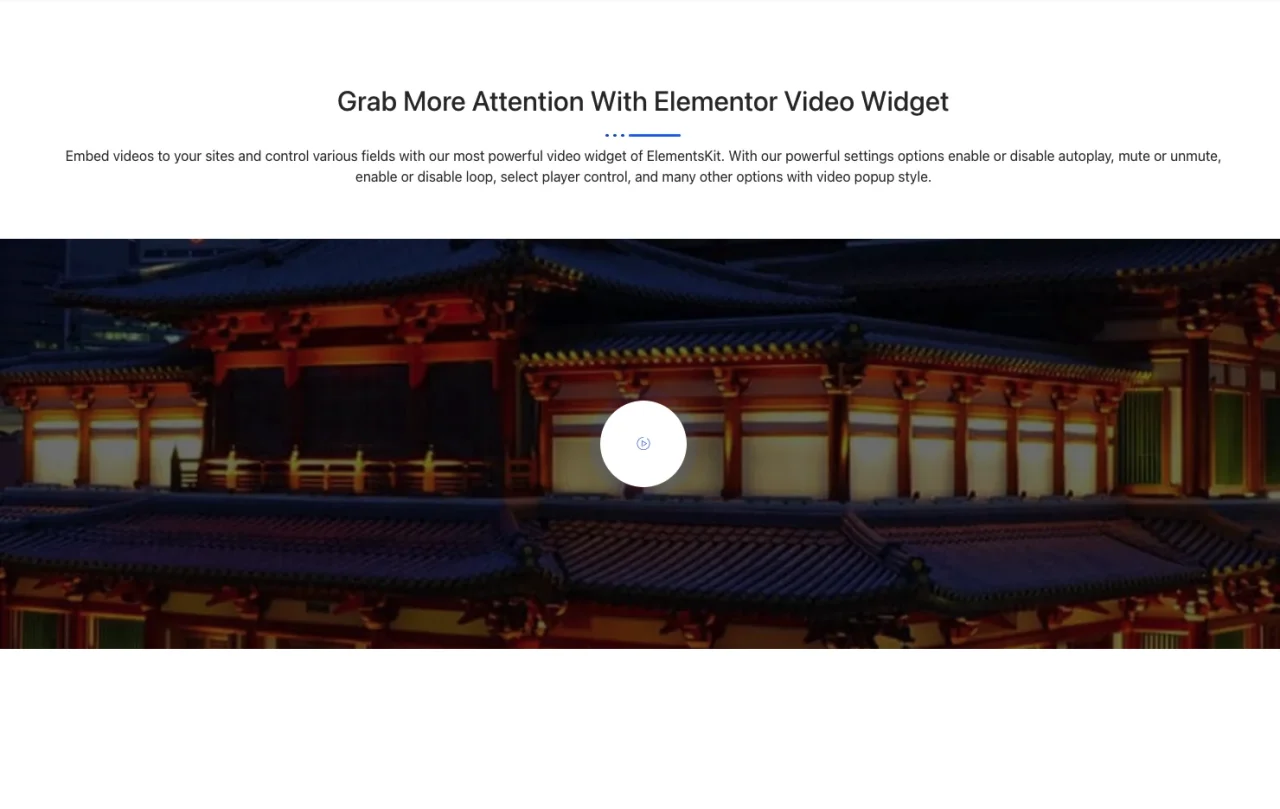 Grab More Attention With Elementor Video Widget Embed videos to your sites and control various fields with our most powerful video widget of ElementsKit. With our powerful settings options enable or disable autoplay, mute or unmute, enable or disable loop, select player control, and many other options with video popup style.
