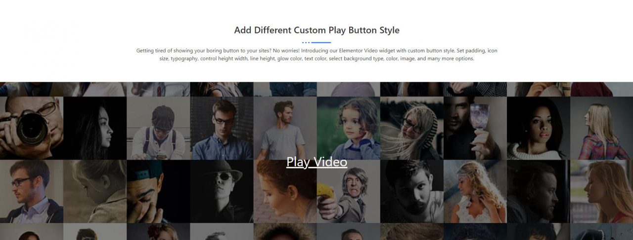 Add Different Custom Play Button Style Getting tired of showing your boring button to your sites? No worries! Introducing our Elementor Video widget with custom button style. Set padding, icon size, typography, control height width, line height, glow color, text color, select background type, color, image, and many more options. Play Video