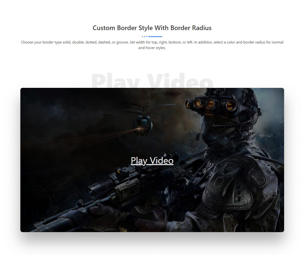 Custom Border Style With Border Radius Choose your border type solid, double, dotted, dashed, or groove. Set width for top, right, bottom, or left. In addition, select a color and border radius for normal and hover styles. Play video Play Video