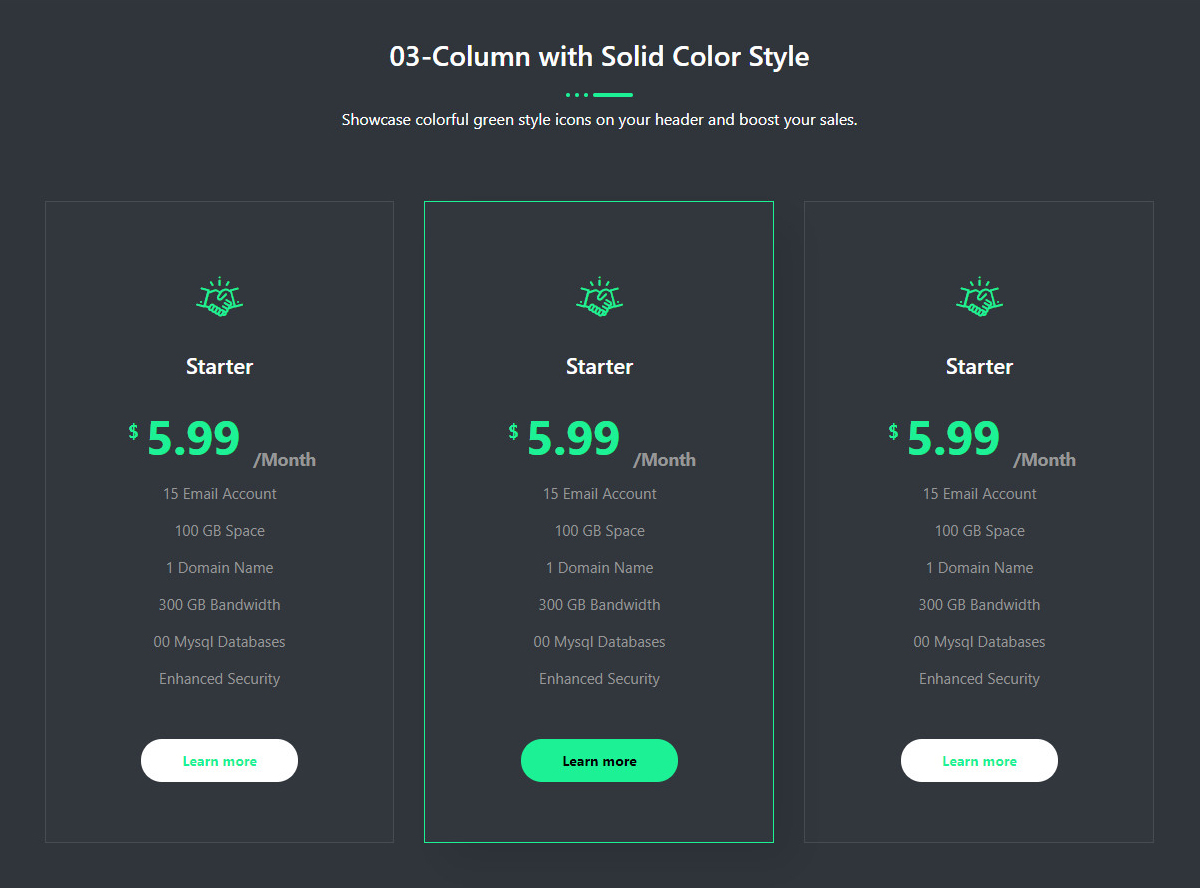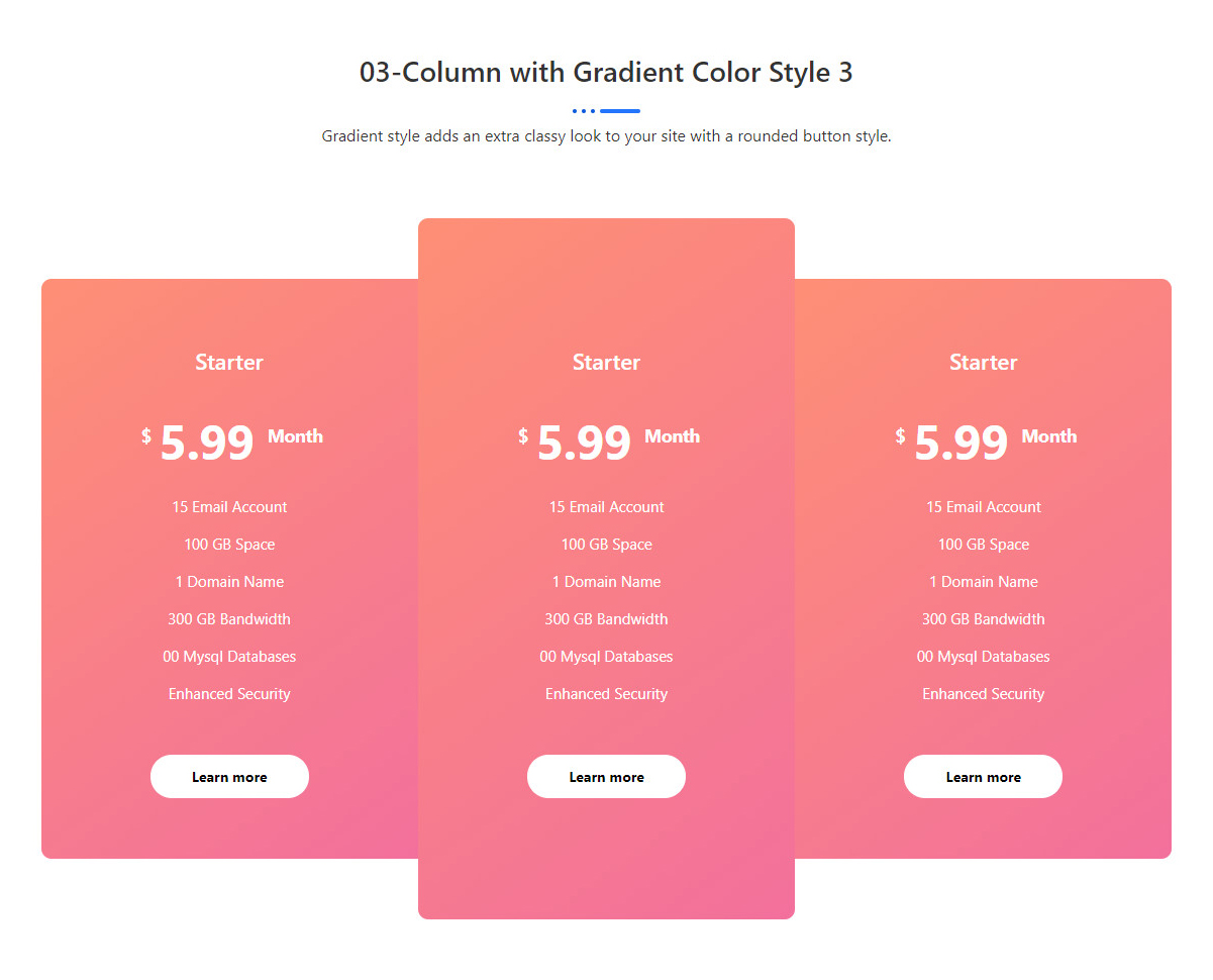 03-Column with Gradient Color Style 3 Gradient style adds an extra classy look to your site with a rounded button style. Starter $ 5.99 Month 15 Email Account 100 GB Space 1 Domain Name 300 GB Bandwidth 00 Mysql Databases Enhanced Security Learn more Professional $ 7.99 Month 15 Email Account 100 GB Space 1 […]