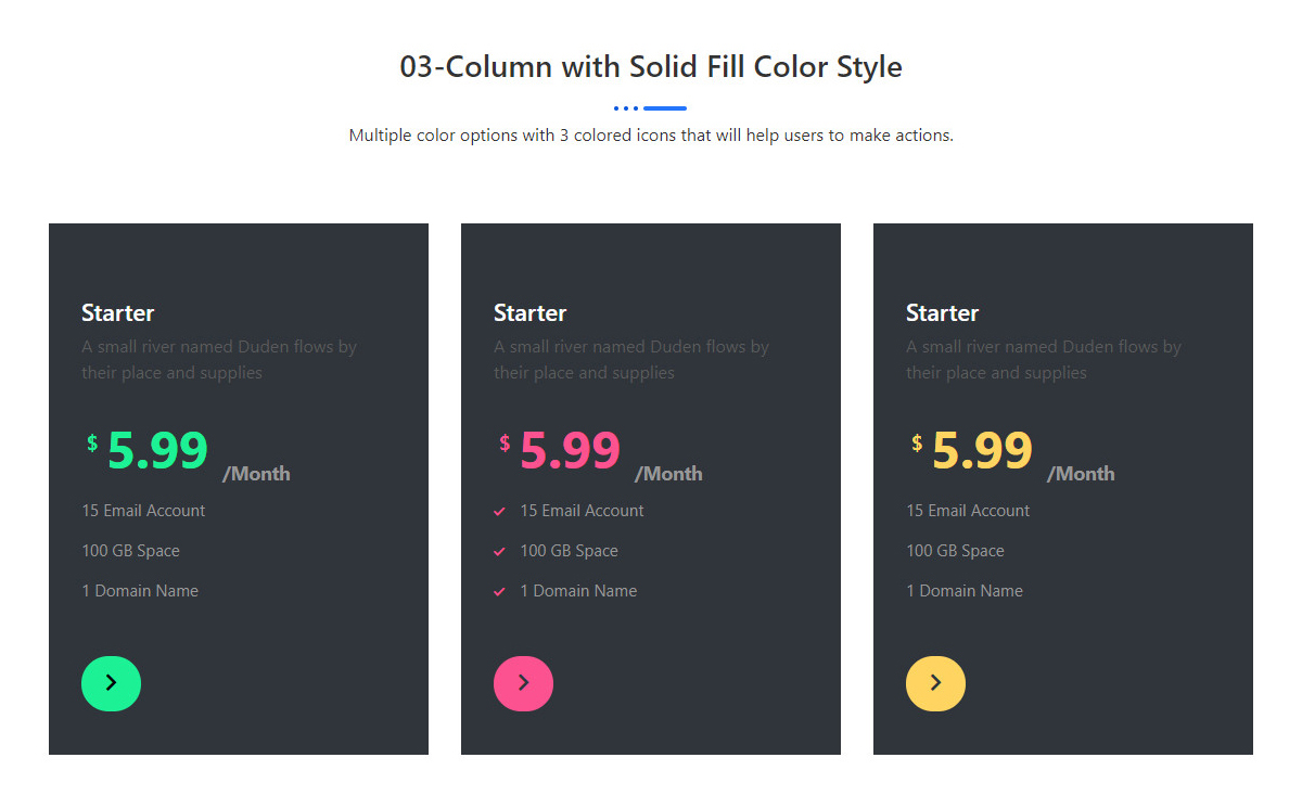 03-Column with Solid Fill Color Style Multiple color options with 3 colored icons that will help users to make actions. Starter A small river named Duden flows by their place and supplies $ 8.99 /Month 15 Email Account 100 GB Space 1 Domain Name Business A small river named Duden flows by their place and […]