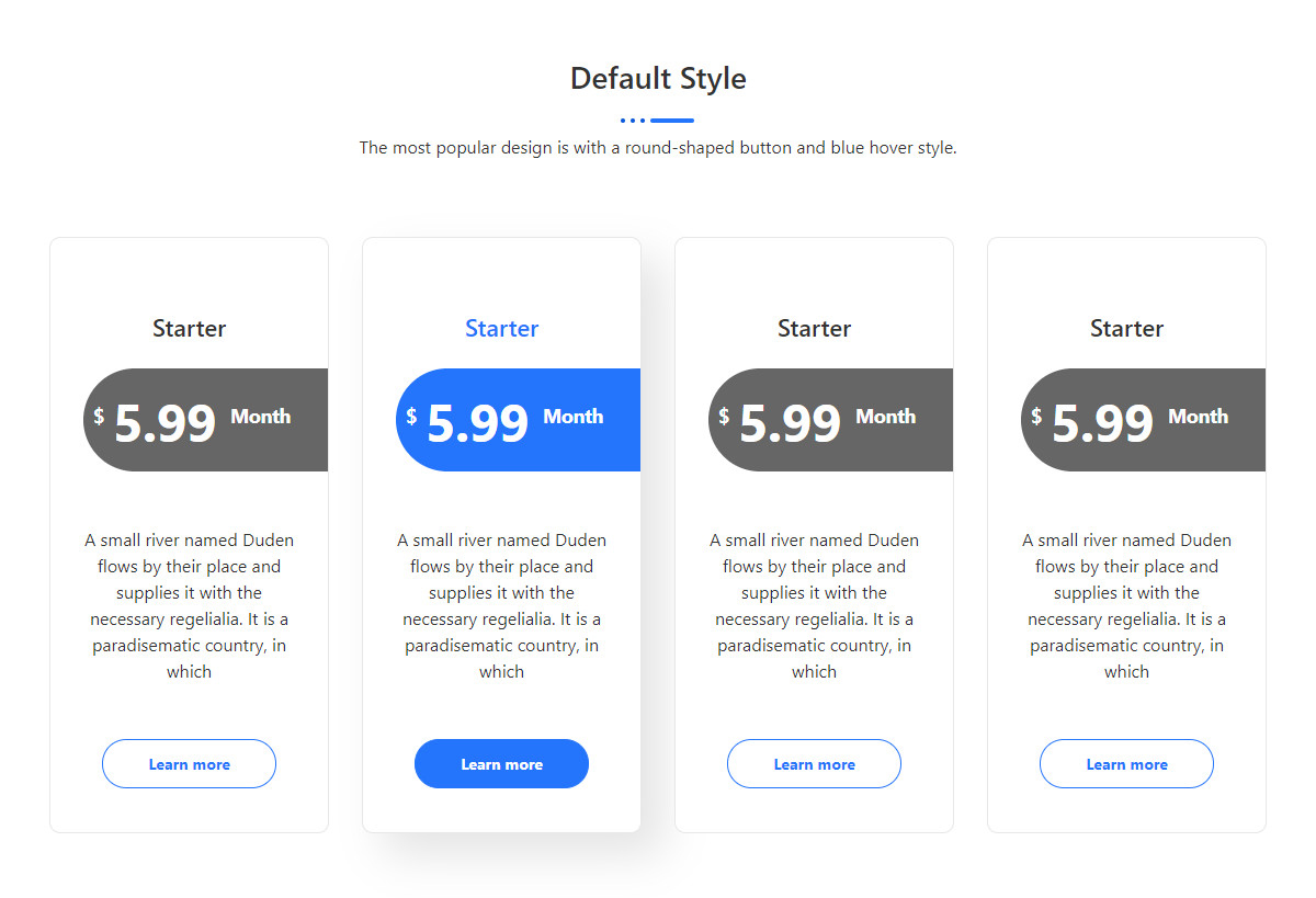 Default Style The most popular design is with a round-shaped button and blue hover style. Starter $ 5.99 Month A small river named Duden flows by their place and supplies it with the necessary regelialia. It is a paradisematic country, in which Learn more Starter $ 5.99 Month A small river named Duden flows by […]