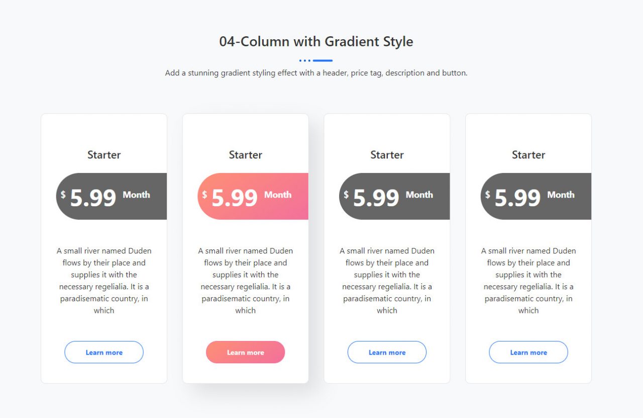 04-Column with Gradient Style Add a stunning gradient styling effect with a header, price tag, description and button. Starter $ 5.99 Month A small river named Duden flows by their place and supplies it with the necessary regelialia. It is a paradisematic country, in which Learn more Starter $ 5.99 Month A small river named […]