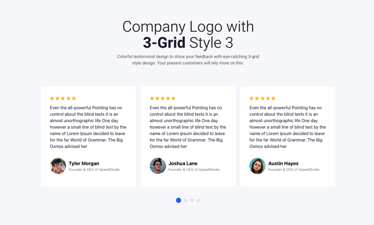 Company Logo with 3-Grid Style 3 Colorful testimonial design to show your feedback with eye-catching 3-grid style design. Your present customers will rely more on this. Even the all-powerful Pointing has no control about the blind texts it is an almost unorthographic life One day however a small line of blind text by the name […]