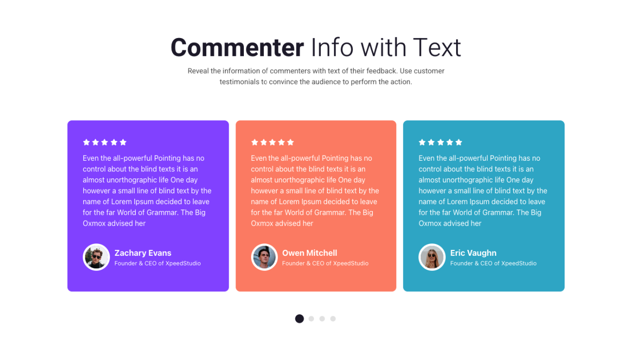 Commenter Info with Text Reveal the information of commenters with text of their feedback. Use customer testimonials to convince the audience to perform the action. Even the all-powerful Pointing has no control about the blind texts it is an almost unorthographic life One day however a small line of blind text by the name of […]