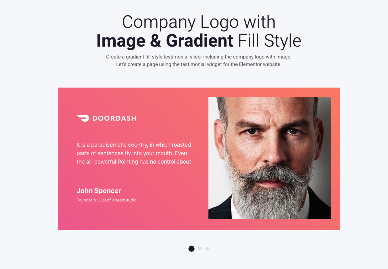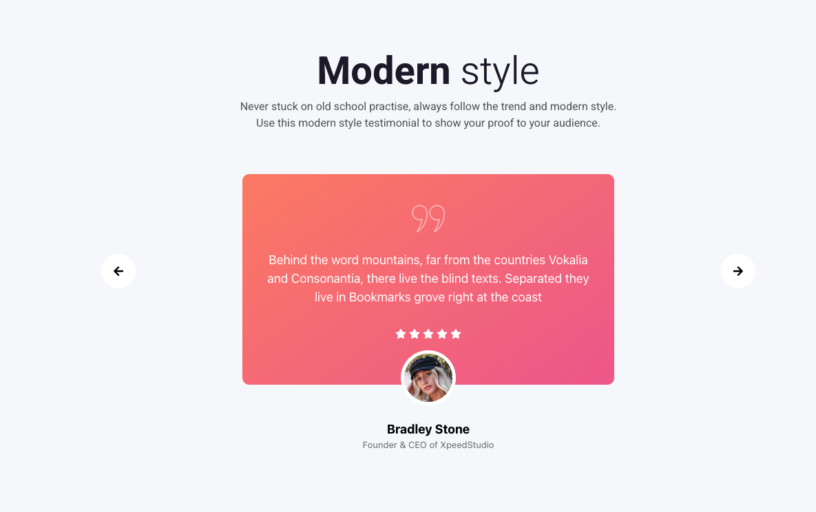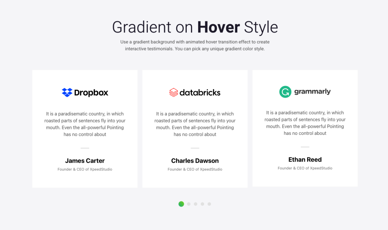 Gradient on Hover Style Use a gradient background with animated hover transition effect to create interactive testimonials. You can pick any unique gradient color style. It is a paradisematic country, in which roasted parts of sentences fly into your mouth. Even the all-powerful Pointing has no control about James Carter Founder & CEO of XpeedStudio […]