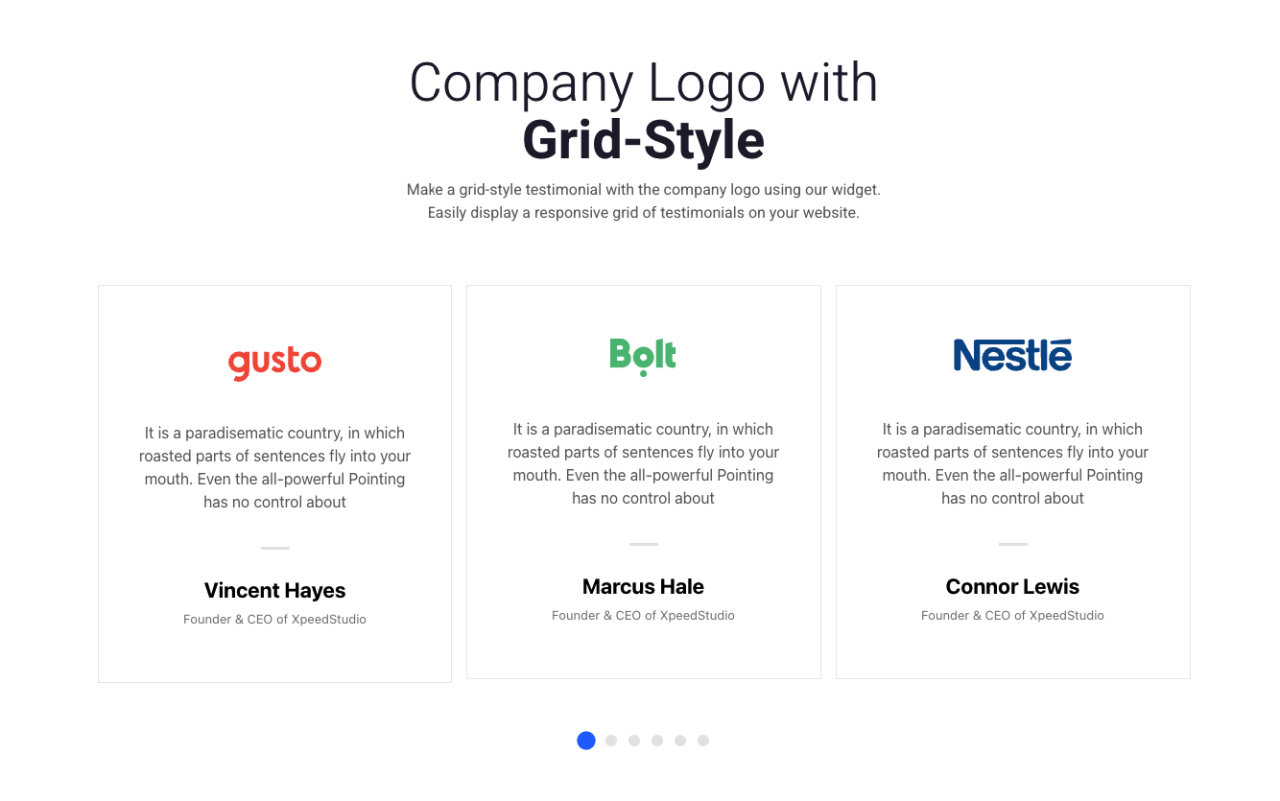 Company Logo with Grid-Style Make a grid-style testimonial with the company logo using our widget. Easily display a responsive grid of testimonials on your website. It is a paradisematic country, in which roasted parts of sentences fly into your mouth. Even the all-powerful Pointing has no control about Vincent Hayes Founder & CEO of XpeedStudio […]