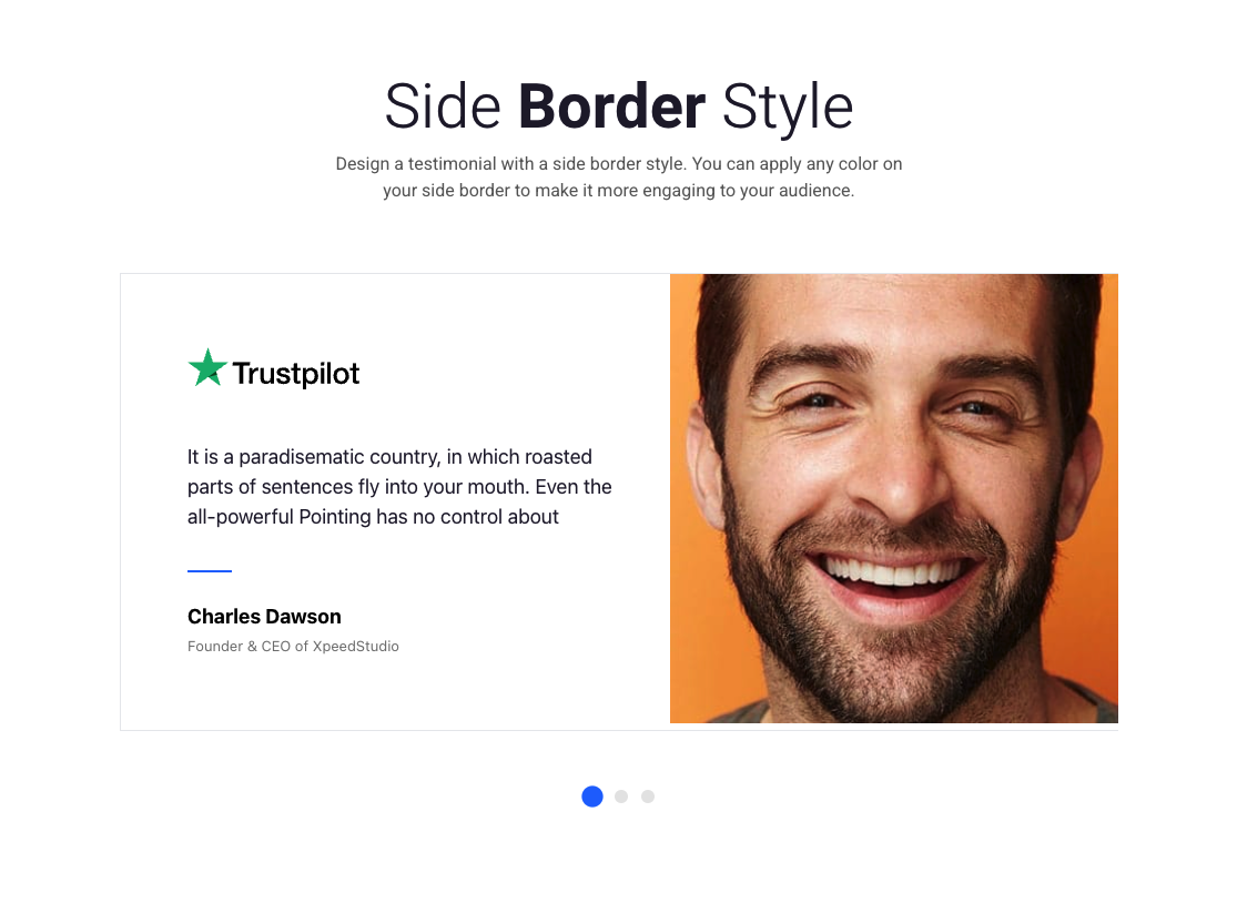 Side Border Style Design a testimonial with a side border style. You can apply any color on your side border to make it more engaging to your audience. It is a paradisematic country, in which roasted parts of sentences fly into your mouth. Even the all-powerful Pointing has no control about Charles Dawson Founder & […]