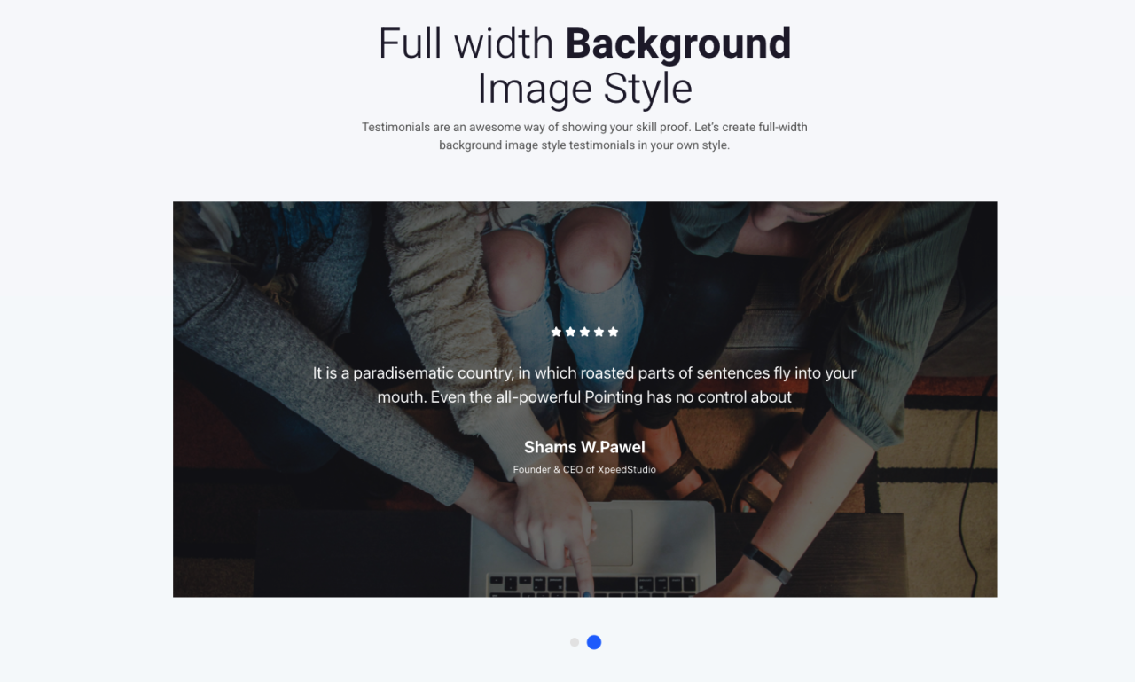 Full width Background Image Style Testimonials are an awesome way of showing your skill proof. Let’s create full-width background image style testimonials in your own style. It is a paradisematic country, in which roasted parts of sentences fly into your mouth. Even the all-powerful Pointing has no control about Andrew Hayes Founder & CEO of […]