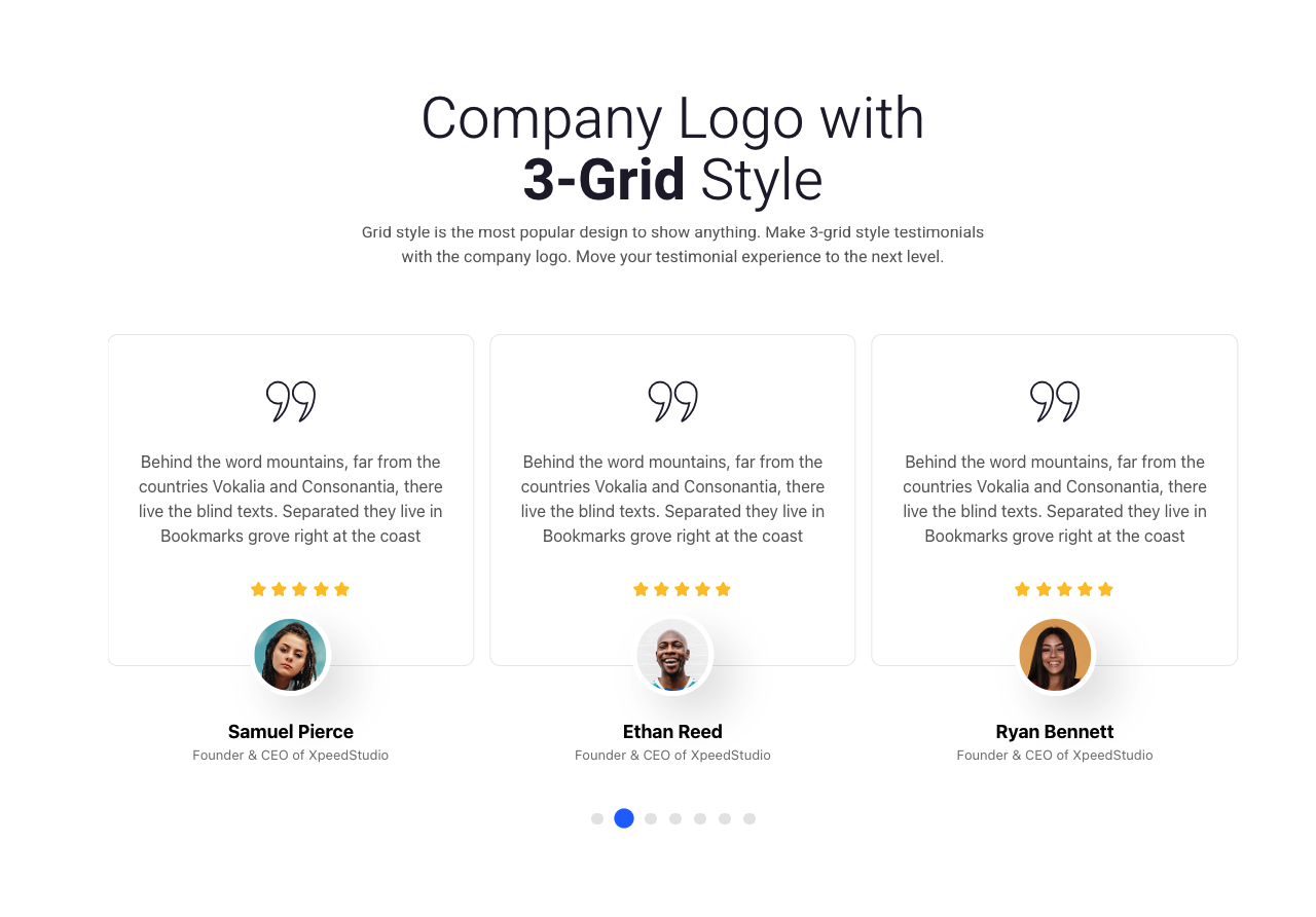 Company Logo with 3-Grid Style Grid style is the most popular design to show anything. Make 3-grid style testimonials with the company logo. Move your testimonial experience to the next level. Andrew Hayes Founder & CEO of XpeedStudio Behind the word mountains, far from the countries Vokalia and Consonantia, there live the blind texts. Separated […]