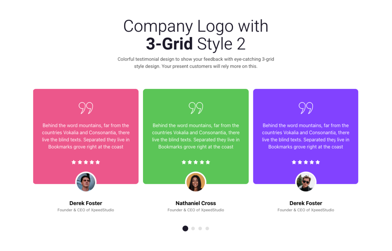 Company Logo with 3-Grid Style 2 Colorful testimonial design to show your feedback with eye-catching 3-grid style design. Your present customers will rely more on this. Derek Foster Founder & CEO of XpeedStudio Behind the word mountains, far from the countries Vokalia and Consonantia, there live the blind texts. Separated they live in Bookmarks grove […]