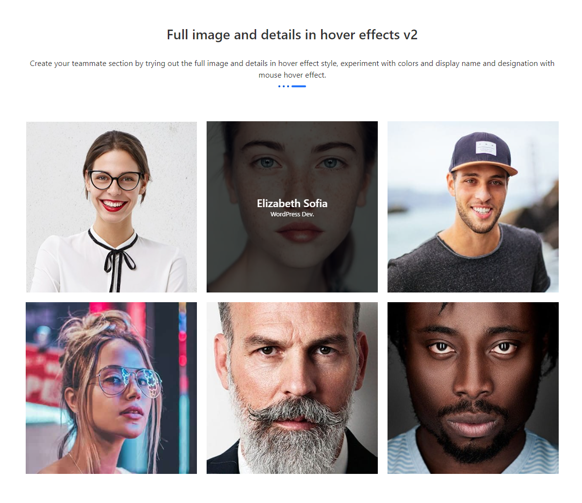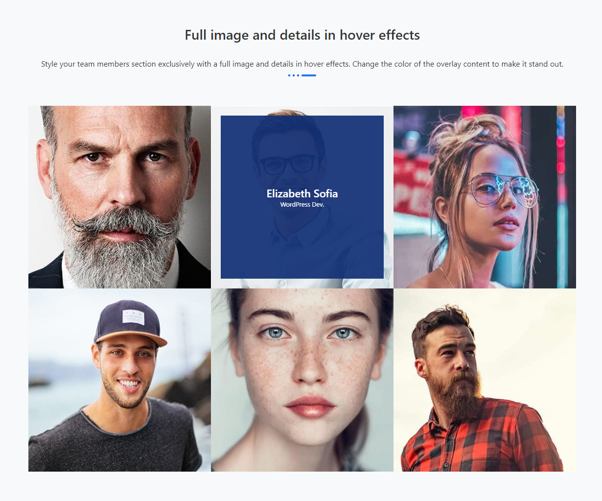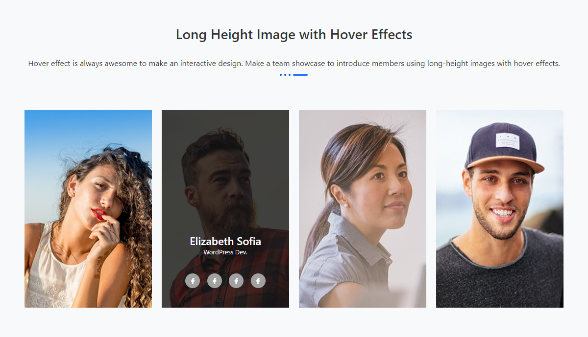 Long Height Image with Hover Effects Hover effect is always awesome to make an interactive design. Make a team showcase to introduce members using long-height images with hover effects. Harrison Hudson WordPress Dev. Harrison Hudson WordPress Dev. A small river named Duden flows by their place and supplies it with the necessary regelialia. It is […]