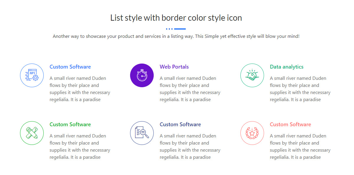 List style with border color style icon Another way to showcase your product and services in a listing way. This Simple yet effective style will blow your mind! Custom Software A small river named Duden flows by their place and supplies it with the necessary regelialia. It is a paradise Web Portals A small river […]