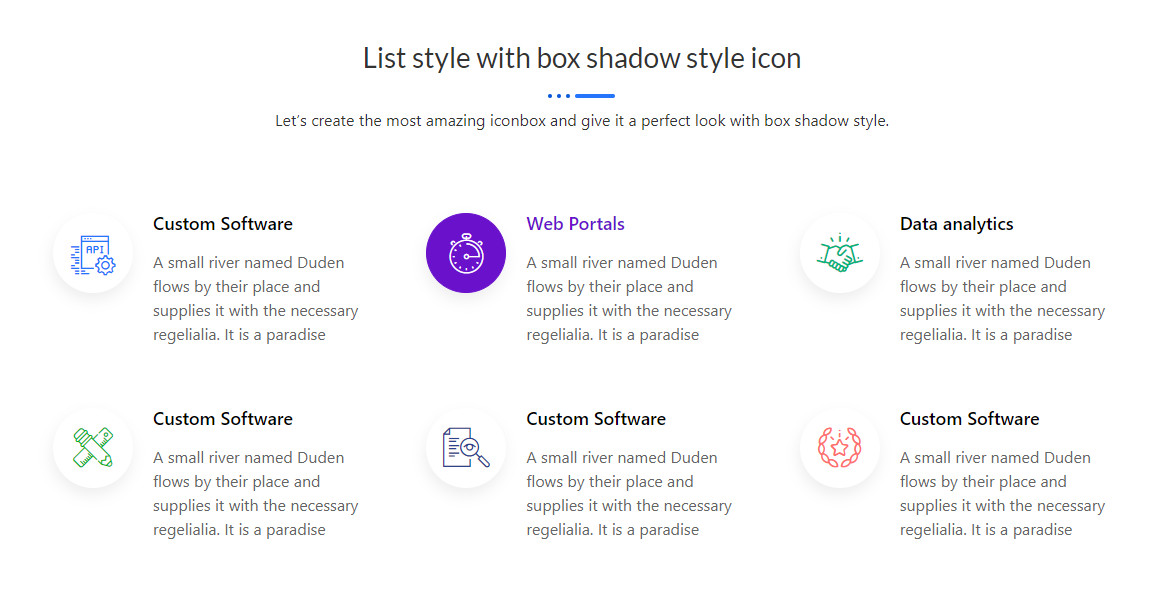 List style with box shadow style icon Let’s create the most amazing iconbox and give it a perfect look with box shadow style. Custom Software A small river named Duden flows by their place and supplies it with the necessary regelialia. It is a paradise Web Portals A small river named Duden flows by their […]