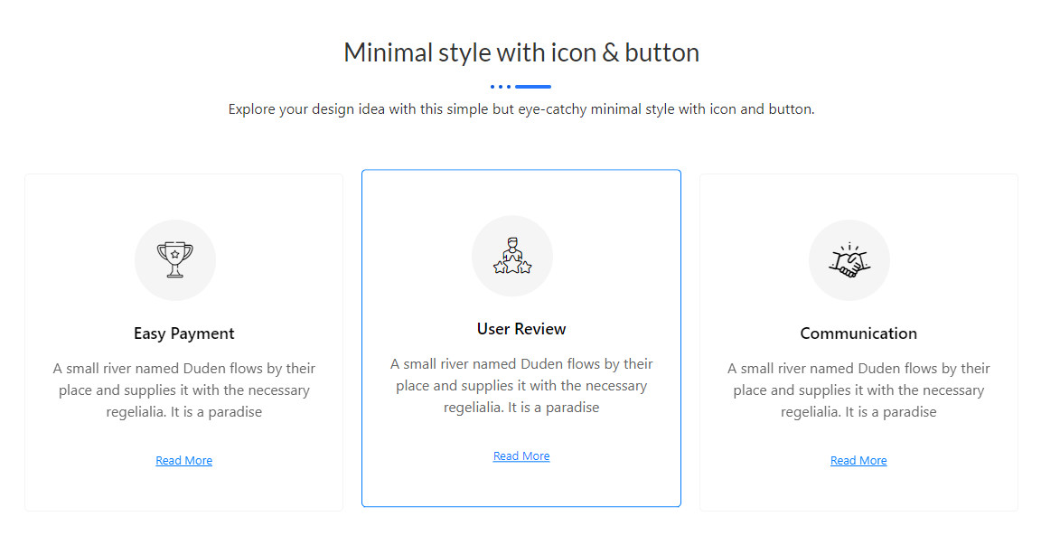 Minimal style with icon & button Explore your design idea with this simple but eye-catchy minimal style with icon and button. Easy Payment A small river named Duden flows by their place and supplies it with the necessary regelialia. It is a paradise Read More User Review A small river named Duden flows by their […]