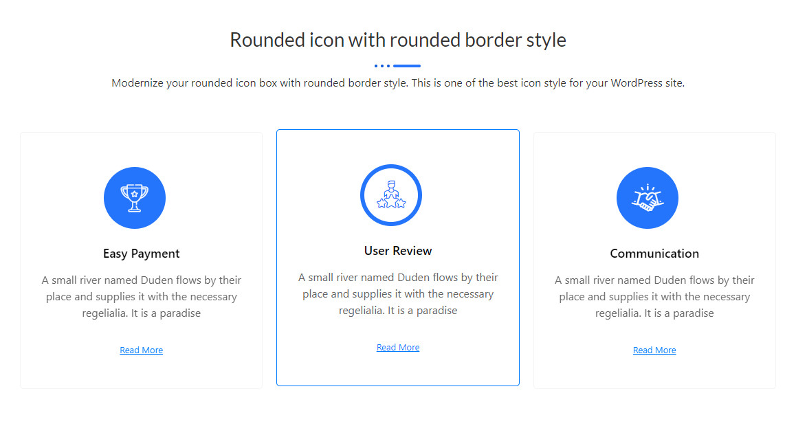 Rounded icon with rounded border style Modernize your rounded icon box with rounded border style. This is one of the best icon style for your WordPress site. Easy Payment A small river named Duden flows by their place and supplies it with the necessary regelialia. It is a paradise Read More User Review A small […]