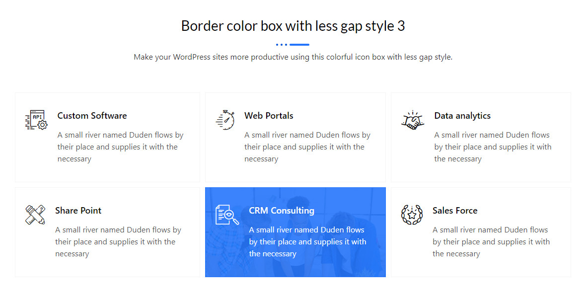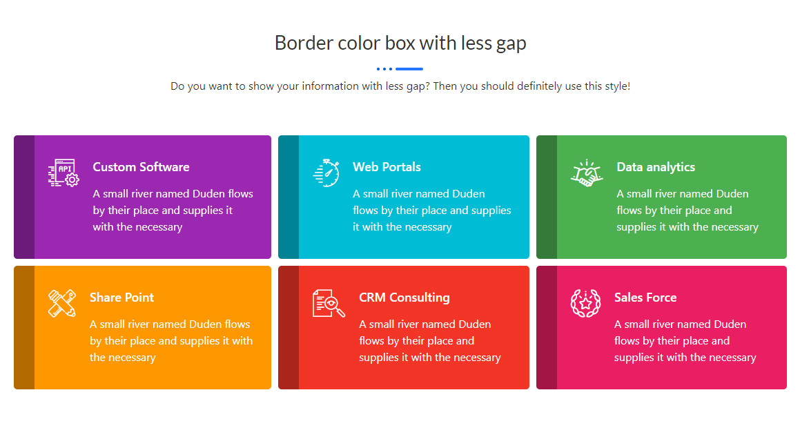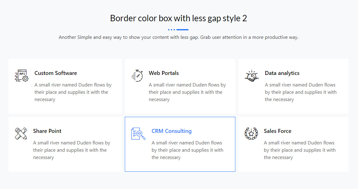 Border color box with less gap style 2 Another Simple and easy way to show your content with less gap. Grab user attention in a more productive way. Custom Software A small river named Duden flows by their place and supplies it with the necessary Web Portals A small river named Duden flows by their […]