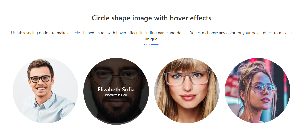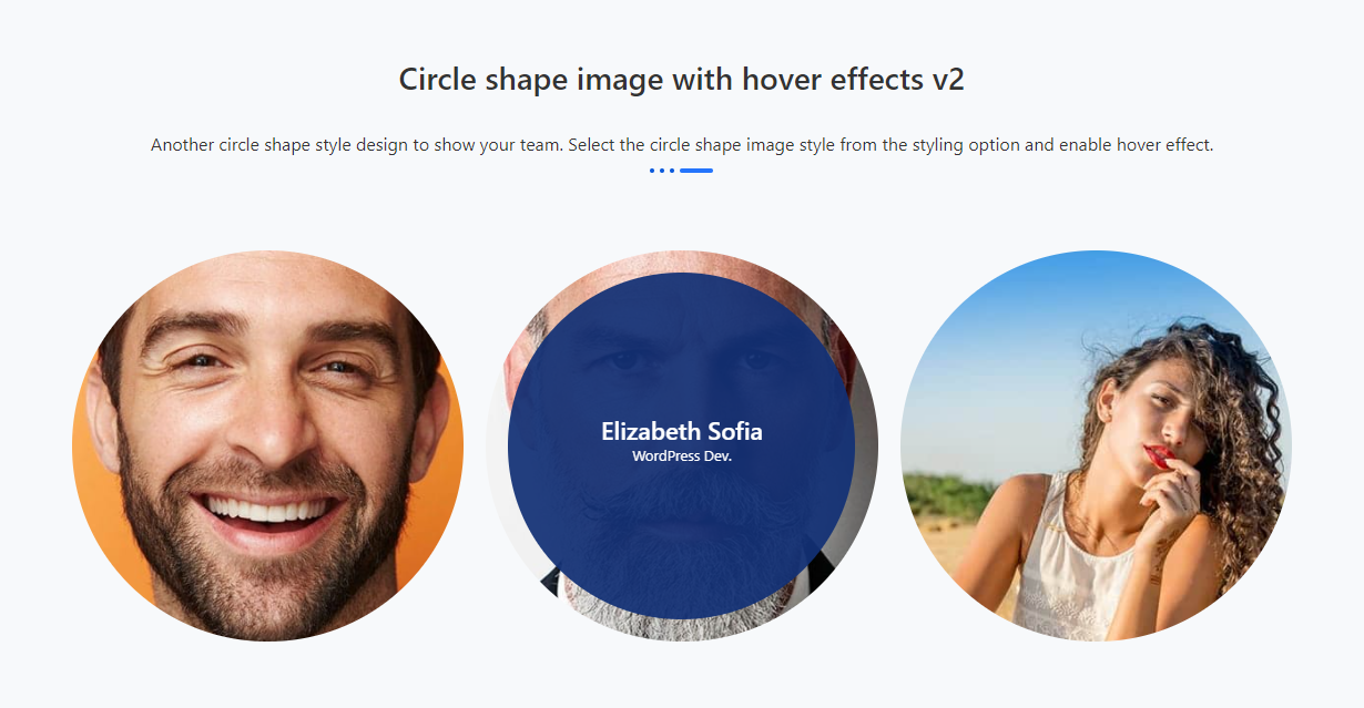 Circle shape image with hover effects v2 Another circle shape style design to show your team. Select the circle shape image style from the styling option and enable hover effect. Harrison Hudson WordPress Dev. Harrison Hudson WordPress Dev. A small river named Duden flows by their place and supplies it with the necessary regelialia. It […]