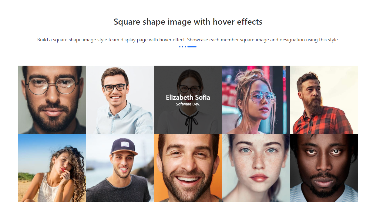 Square shape image with hover effects Build a square shape image style team display page with hover effect. Showcase each member square image and designation using this style. Harrison Hudson WordPress Dev. Harrison Hudson WordPress Dev. A small river named Duden flows by their place and supplies it with the necessary regelialia. It is a […]
