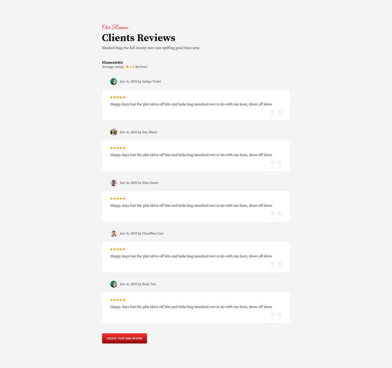 Reviews Home Our Reviews Clients Reviews Sloshed blag the full monty nice one spiffing good time arse. ElementsKit Average rating: 4.5 Reviews Jun 16, 2022 by Indigo Violet 5/5 Happy days lost the plot skive off bits and bobs bog-standard owt to do with me boot, show off show off pick your nose and […]