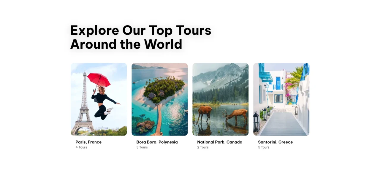 Explore Our Top Tours Around the World Paris, France 4 Tours Bora Bora, Polynesia 3 Tours National Park, Canada 2 Tours Santorini, Greece 5 Tours