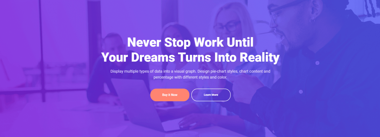 Never Stop Work UntilYour Dreams Turns Into Reality Display multiple types of data into a visual graph. Design pie-chart styles, chart content and percentage with different styles and color. Buy it Now Learn More