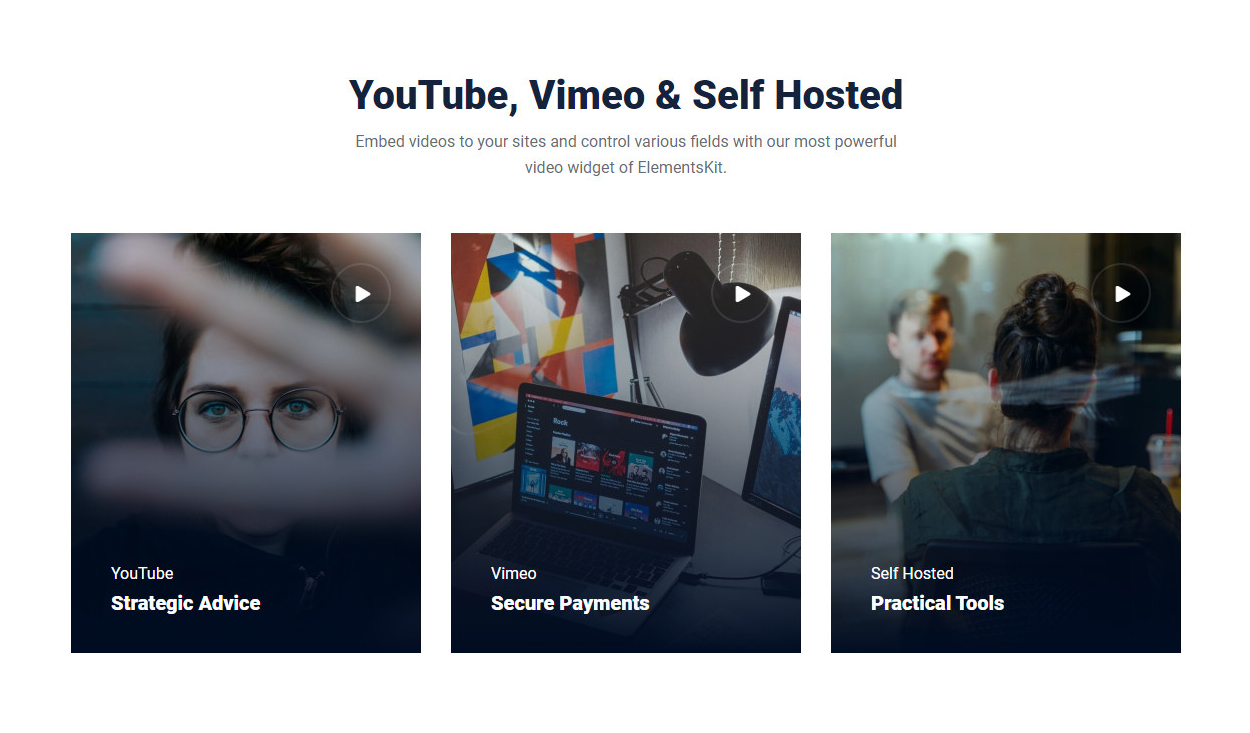 YouTube, Vimeo & Self Hosted Embed videos to your sites and control various fields with our most powerful video widget of ElementsKit. YouTube Strategic Advice Vimeo Secure Payments Self Hosted Practical Tools