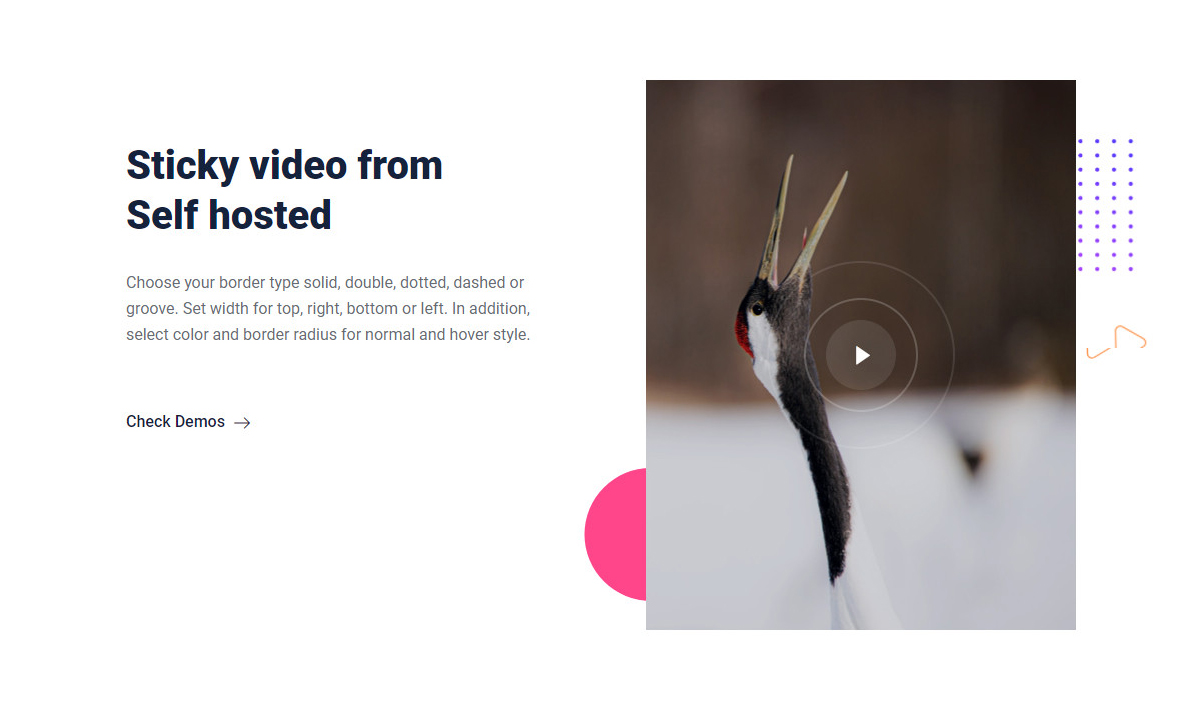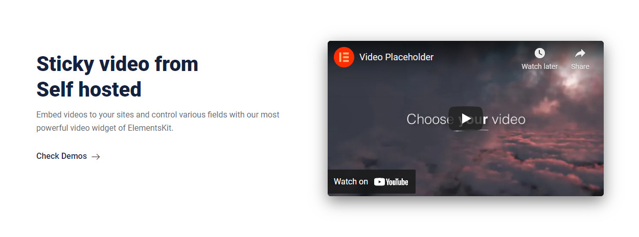 Sticky video from Self hosted Embed videos to your sites and control various fields with our most powerful video widget of ElementsKit. Check Demos