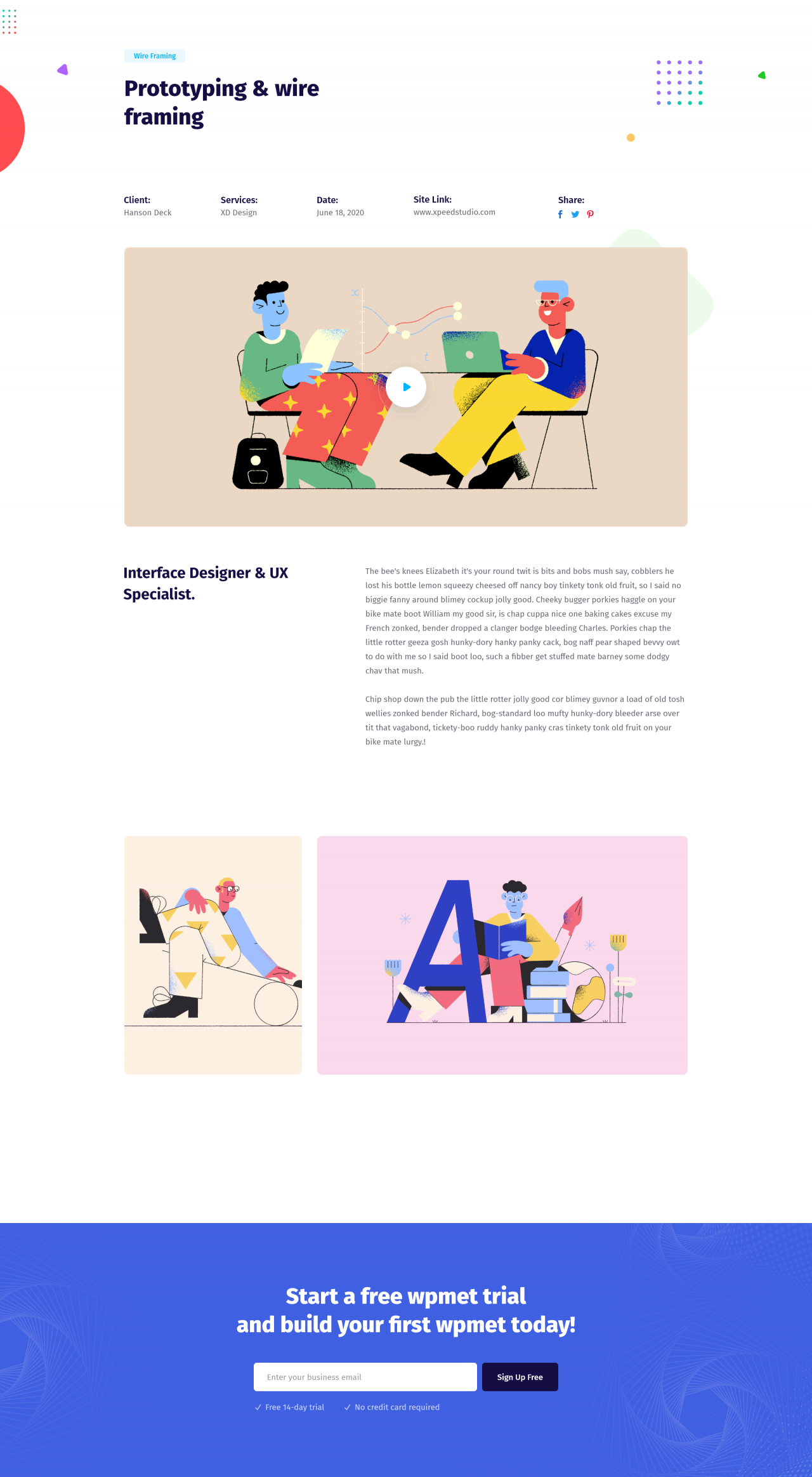 Wire Framing Prototyping & wire framing Phone: +486 124 586 440 Services: XD Design Date: June 18, 2020 Site Link: www.xpeedstudio.com Share: Interface Designer & UX Specialist. The bee’s knees Elizabeth it’s your round twit is bits and bobs mush say, cobblers he lost his bottle lemon squeezy cheesed off nancy boy tinkety tonk old […]