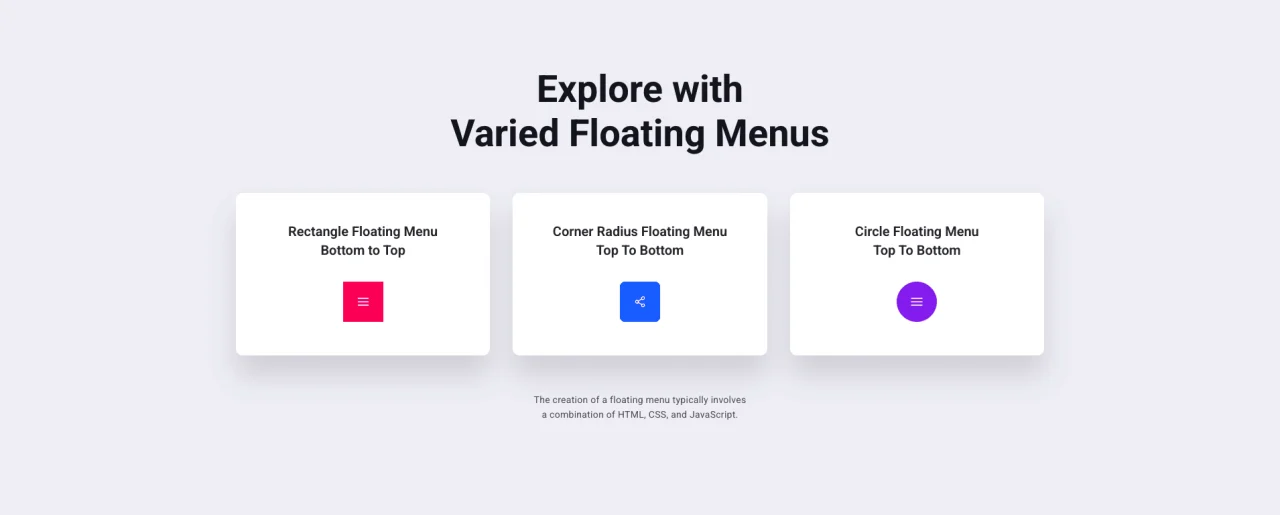 Explore with Varied Floating Menus Rectangle Floating Menu Bottom to Top Home Products Services About Corner Radius Floating Menu Top To Bottom Home Facebook Instagram Twitter Linkedin Circle Floating Menu Top To Bottom Home Products Services Contact The creation of a floating menu typically involves a combination of HTML, CSS, and JavaScript.
